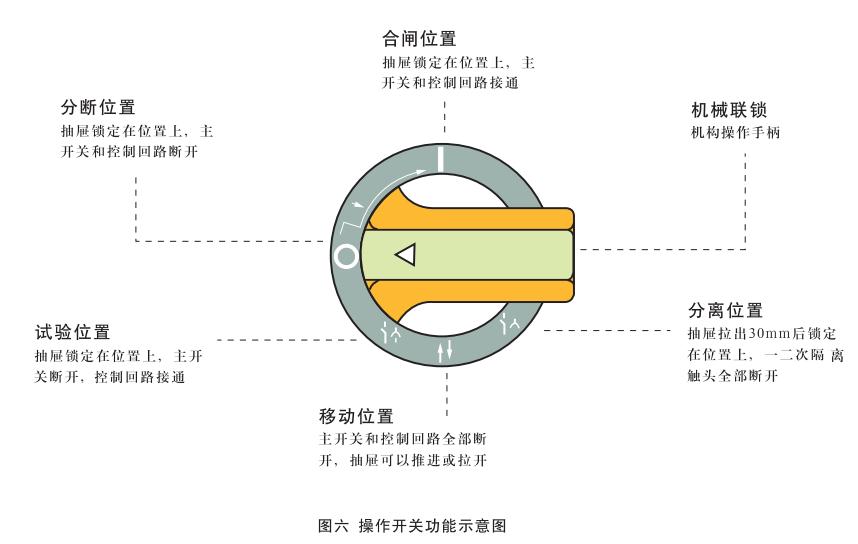 抽屜插入后,將手柄順時(shí)針?lè)较蜣D(zhuǎn)動(dòng)時(shí),首先到達(dá)“試驗(yàn)位置”(↓),此時(shí)機(jī)構(gòu)將外部電源引入控制回路,用戶通過(guò)面板上的安全電器(假如有的話)對(duì)電路進(jìn)行試操作,以確認(rèn)其是否符合要求,由于主開(kāi)關(guān)尚處于斷開(kāi)狀態(tài),因此一次回路處于無(wú)電狀態(tài),即使操作結(jié)果與要求不符也不會(huì)損壞設(shè)備,繼續(xù)順時(shí)針?lè)较蜣D(zhuǎn)動(dòng)到手柄處于水平位置時(shí),即“分?jǐn)辔恢?rdquo;(0)。此時(shí)一次和二次回路均處于無(wú)電狀態(tài),沿順時(shí)針?lè)较蚶^續(xù)旋轉(zhuǎn)90°則手柄轉(zhuǎn)到“合閘位置”(I),見(jiàn)圖六。